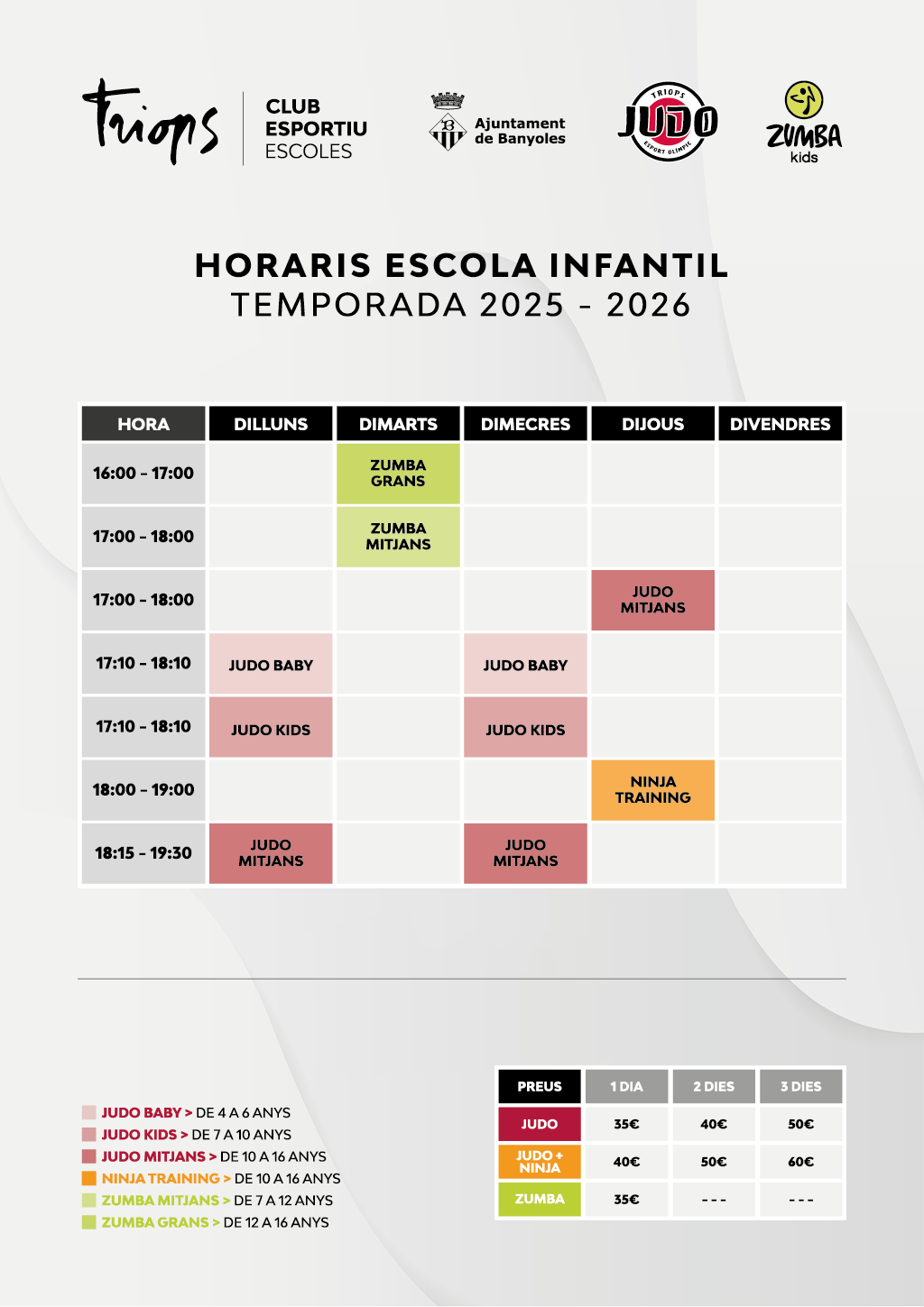 El judo és un esport que destaca en etapes inicials de la infància pels beneficis de coordinació, psicomotricitat, equilibri i expressió corporal. A més, aporta un augment d’autoestima, autoconfiança i autocontrol a les persones que el practiquen. A Triops, desenvolupem la pràctica i l’aprenentatge d’aquest esport olímpic a través del joc, el respecte, el coratge i el companyarisme.